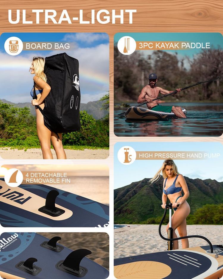 - High standard professional accessories. Considering that women and teenagers can quickly inflate and deflate the paddle board, it comes with a double action pump equipped with a precise measuring and sealing hose for accurate psi readings.