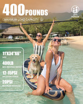 - Excellent performance and stability. In terms of material and size selection, DAMA inflatable paddle boards are constructed from advanced imported materials and undergo rigorous quality control to ensure that air does not leak. The paddle boards for adults feature the most ergonomic dimensions11'*34"*6", with a maximum weight capacity of 400 pounds. Their stable structure and design can accommodate 1 to 3 people or your beloved pet.
